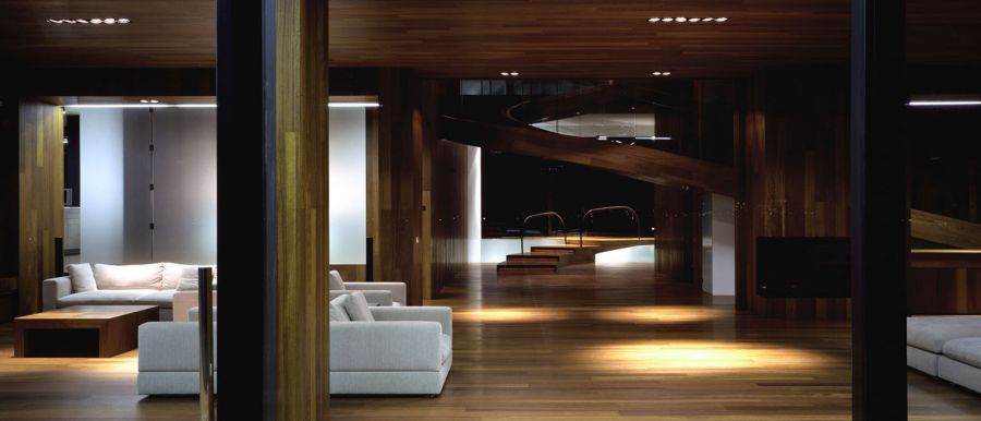 the pillow is glazed and overlooks the lake. The floor is organised in levels according to the outside landscape