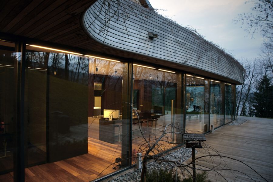 of the existing villa. The extension forms a rounded base around the house a pillow covered by the landscape.