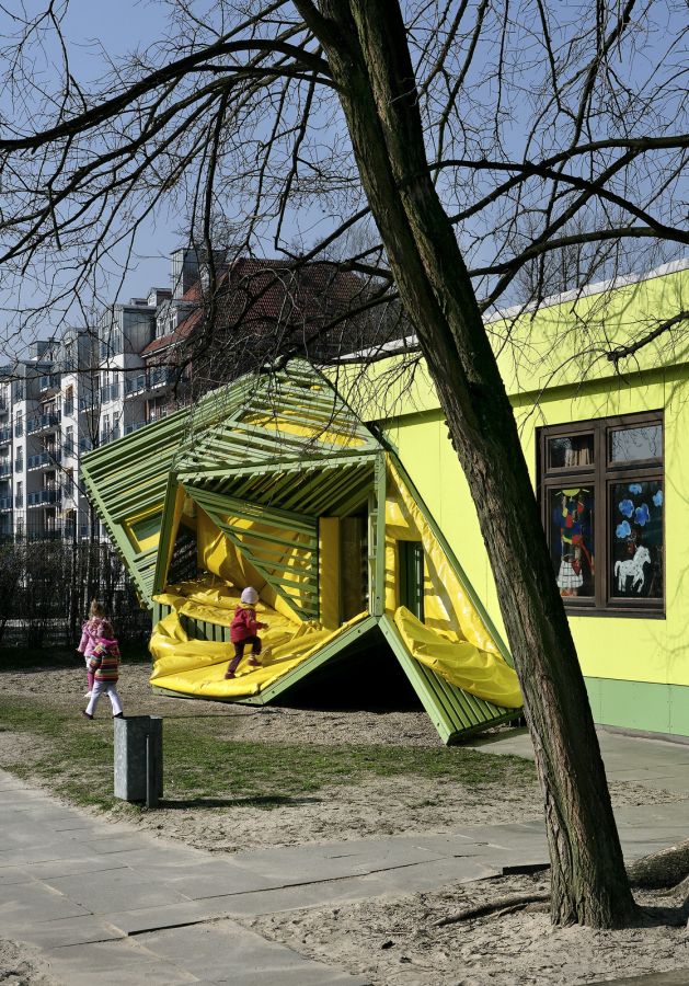 It has become an oblique climbing frame made of green oak wood covered by yellow membrane with