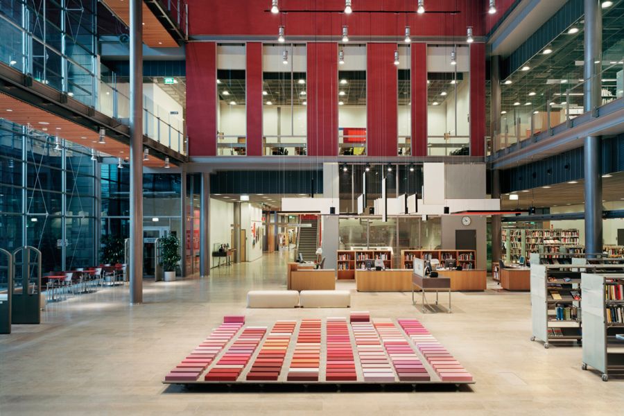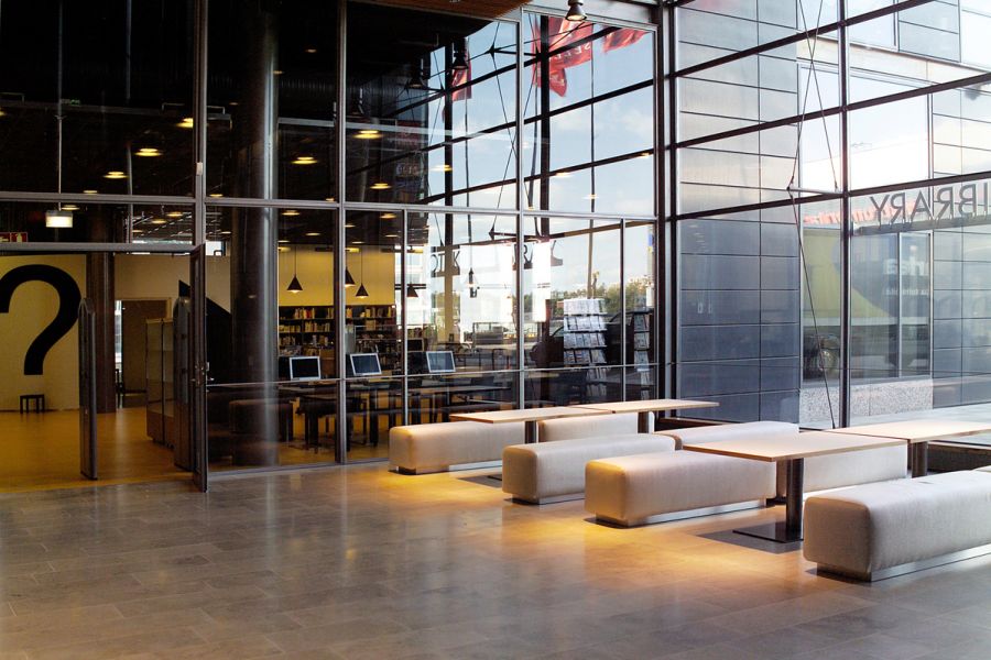 The lobbies of the Library and the outside market place are visually connected through gigantic glass wall