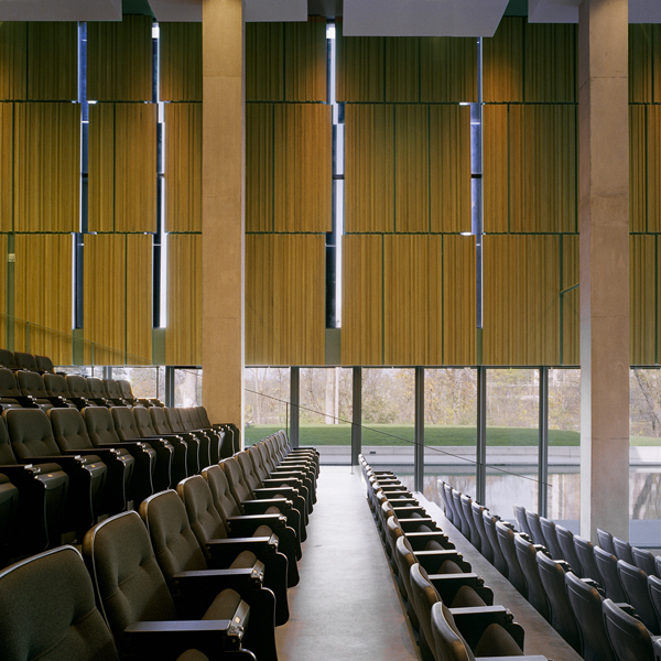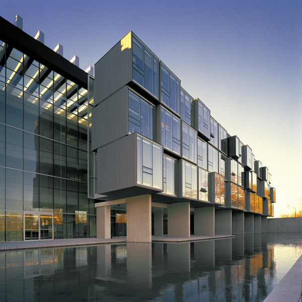 The design draws much inspiration from the wide-ranging, hard to define concepts that make up the subject matter of theoretical physics, at once micro- and macrocosmic, rich in information and of indeterminate form and substance. Between city and park, the Perimeter Institute expands and inhabits the improbable space of the line separating the two. The building defines the secure zones of the Institute's facilities within a series of parallel glass walls, embedded in an erupting ground plane that reveals a large reflecting pool.