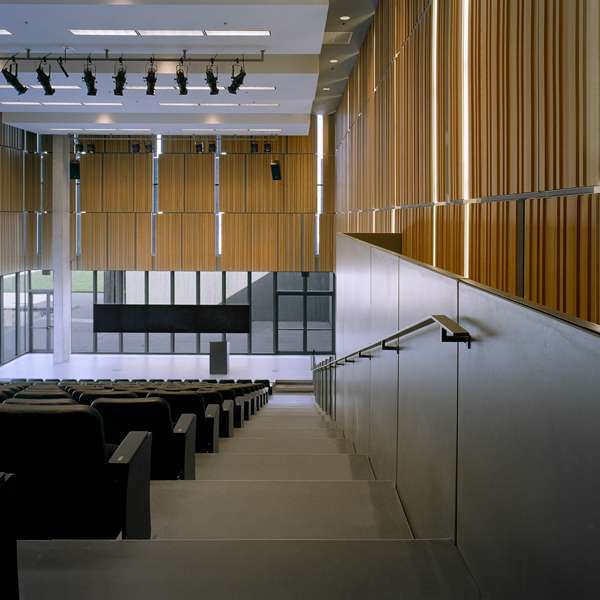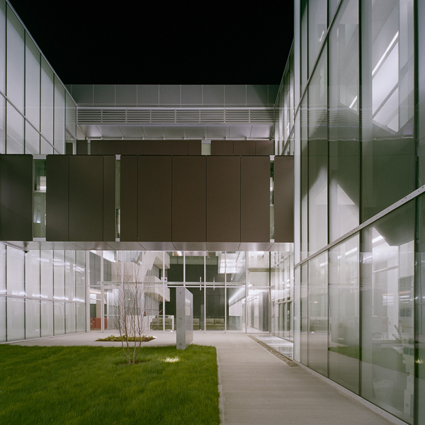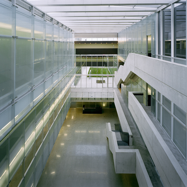 The interior of the Institute is organized around two central spaces, the main hall on the ground floor and the garden on the first. Spaces for administration, meeting and seminar rooms, leisure and fitness spaces, and a multipurpose theatre for symposia and public presentations, have direct access to the main hall. The circulation corridors running east-west are positioned between the opalescent glass planes, which are occasionally punctured and shifted to reveal views across the interior space of the hall. Vertical circulation climbs these walls, tendrils of ground that run from the garden through the building. The garden - nature emerging from the vacuum - is crossed by three bridges that puncture all the planes, as well as the north and south façades. The bridges provide quick access to information, facilities and research colleagues. These conduits, which formally bind together the Institute, are routes crossing the improbable space between theoretical physics and everyday life.
