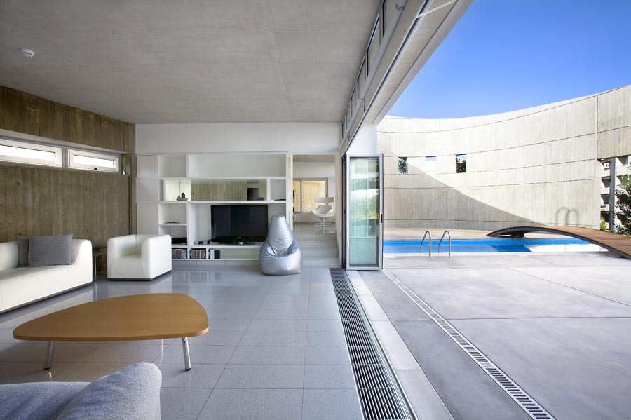 That is why the compact skin, which encompasses the residence and enclose the open space, revealed on the west. The natural elements enter the residence, changing gradually in colours and being filtered at the top of her volume. As for the water, being free and erosive is piercing the skin to a point at the south.