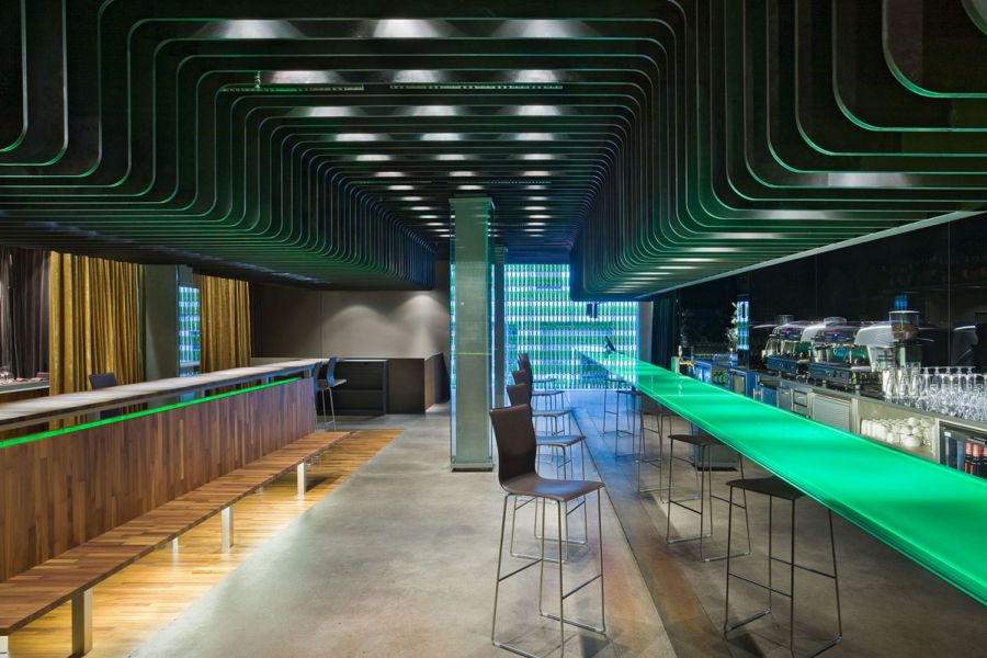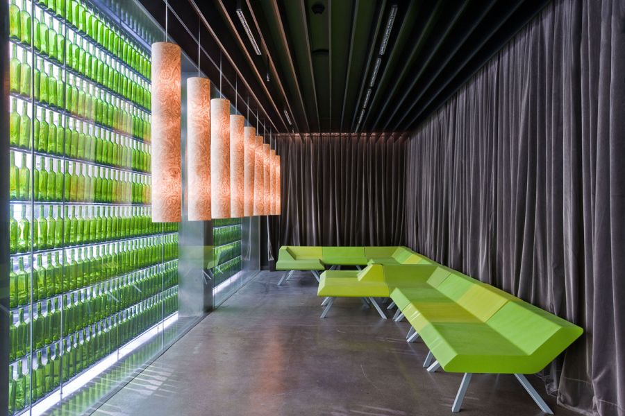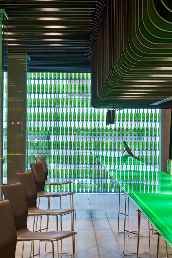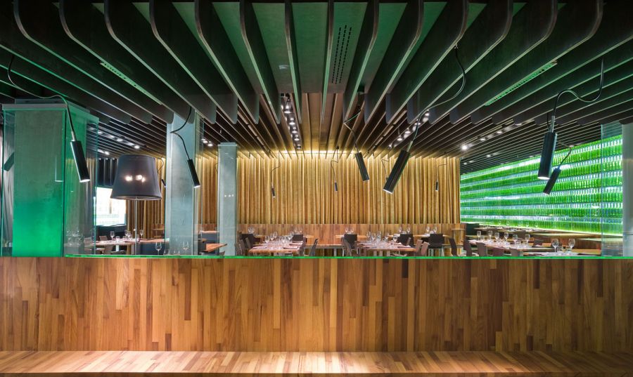 Arguments: always the same: abstract metaphors related to what happens around the project, client, location, usage, ... In this case the use of partners elements with kitchen- food-market, out of context and offered and presented as pictures of Warhol: empty bottle (or drink), pans, butcher tables, ... not as simple slides, but architected (if that word exists): lattice of green glass bottles, lamps and acoustic ceilings of caldrons, tables, benches and floors of tables butcher ...