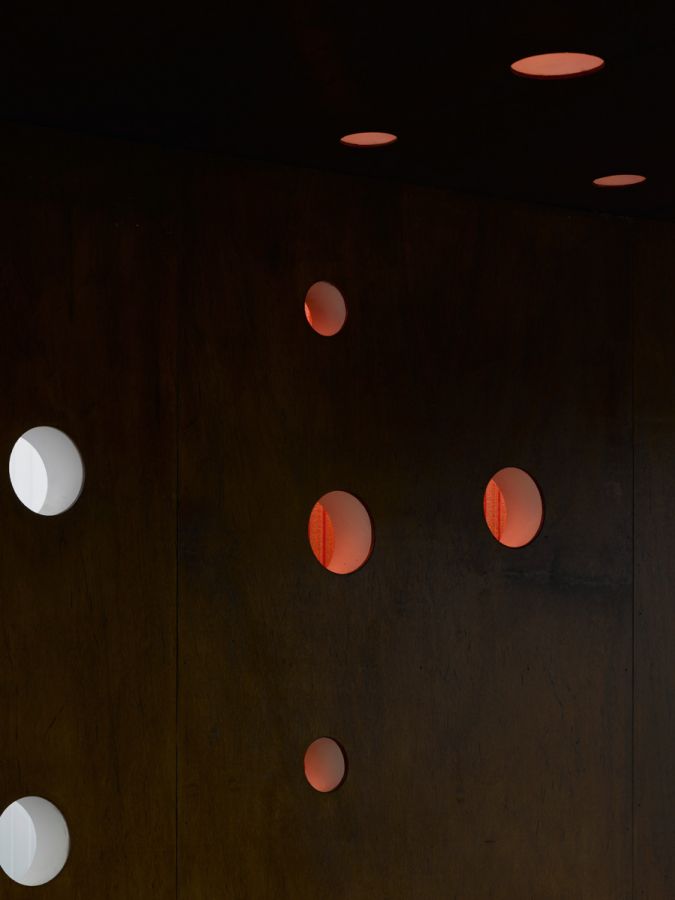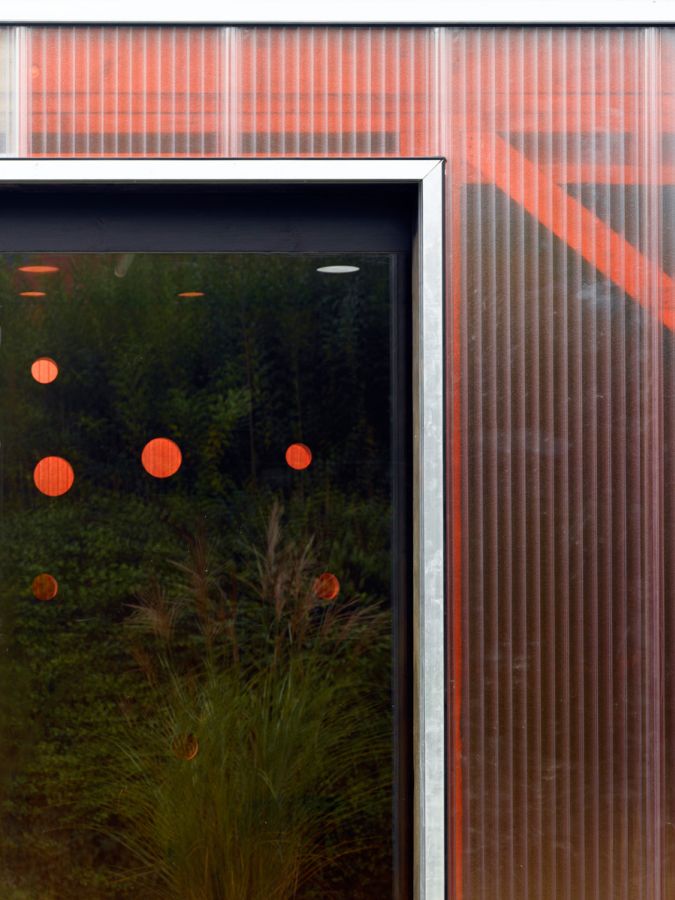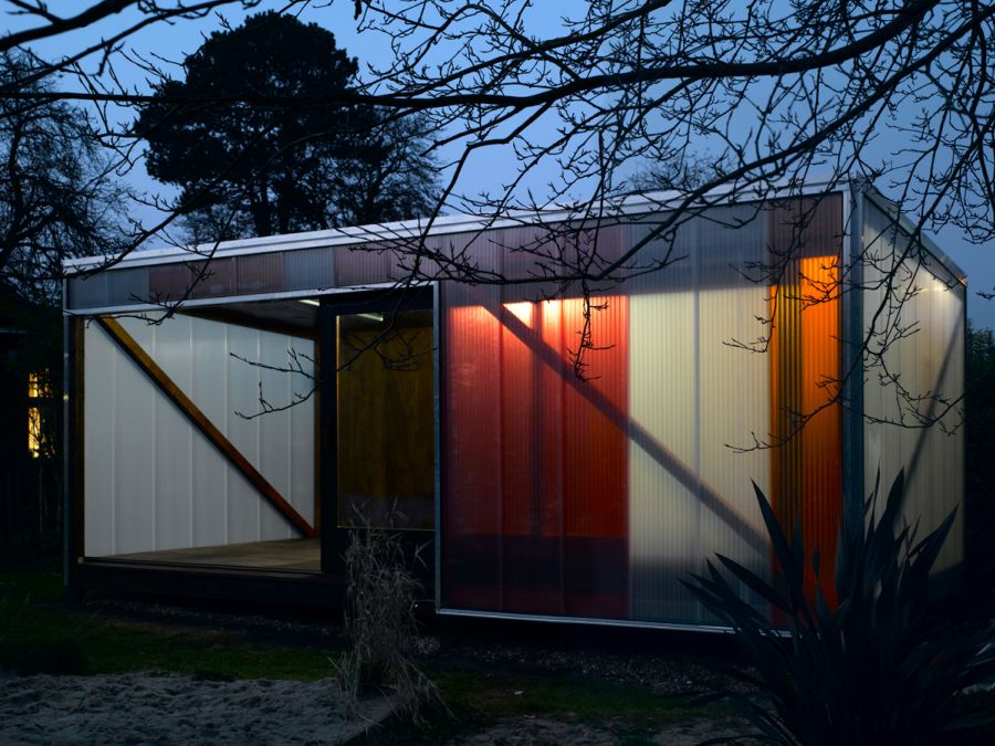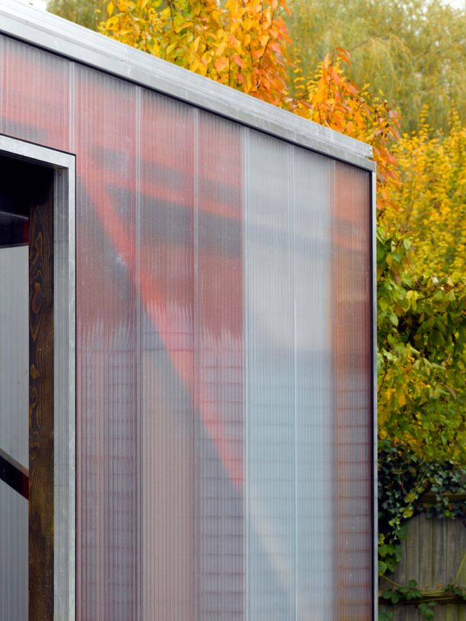 The single-storey out-building combines simplicity of form with neat architectural devices to create a visually exciting building. The tiny budget demanded creative solutions that reduced the number of materials and building trades otherwise required. Where possible, elements were combined such as the structural plywood, which is also used as the internal finish. Crucially, the polycarbonate Rodeca cladding offered rigidity, lightness, water-tightness, translucency, colour and cost-efficiency, eliminating the need for studwork, waterproofing and windows. Several aperatures in the plywood skin allow pools of coloured light into the building during the day, and to emit colour to the surrounding areas at night.