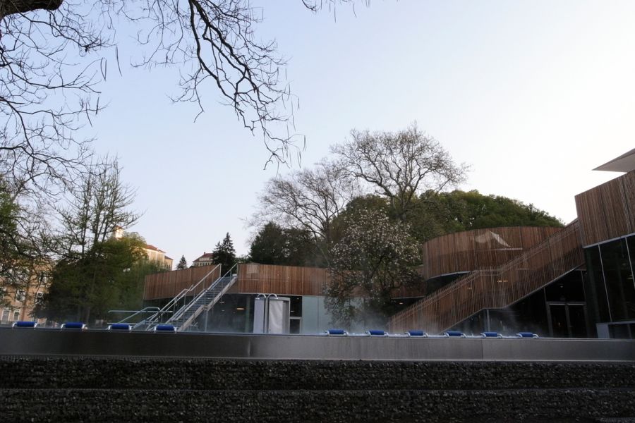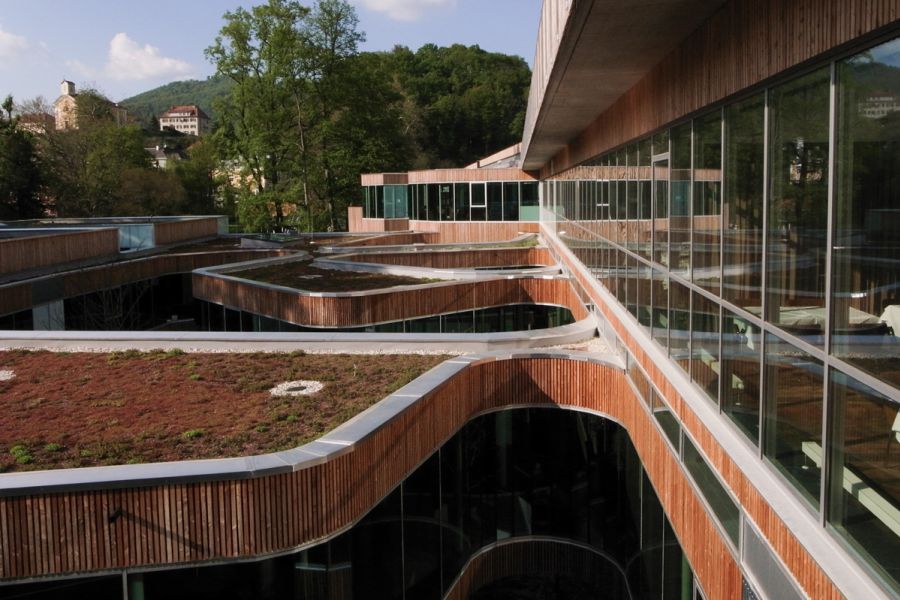 The project is situated in a protected park and consist of a treatment area with about 50 different rooms for medical treatments, a four star hotel with several different restaurants and cafes, and a public thermal bath for the patients and other guests.