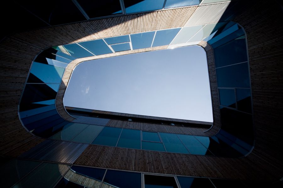The waiting areas in the middle of the treatment rooms for the patients are shaped around courtyards allowing sun and views to the trees, as to give the patients the impression of waiting in the park itself. A full treatment might last for several days and can consist of a number of different treatments, like different types of massages and baths in smaller private treatment rooms, a visit to a cold room with minus 110 degrees Celsius etc. Between these treatments the patients wait in the open and transparent waiting areas where the park is always close. One of the main aims of the architecture has been to un-institutionalize the architecture, make it resemble a hospital in as few ways as possible. The interior has been designed by an advertising bureau.