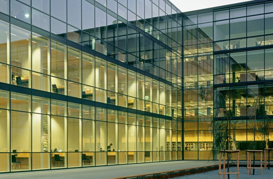 in a reading gallery facing the large open entrance square. A spacious public terrace