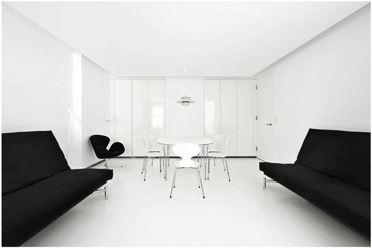 Wszystkie meble w apartamencie kontynuują ograniczoną paletę kolorów wnętrz: są albo białe albo czarne.
