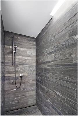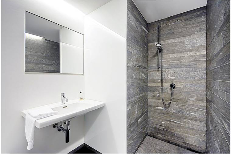 minimalizmu. W łazience jest nawet nawiązanie do tutejszych term. Wnęka prysznica wyłożona jest w