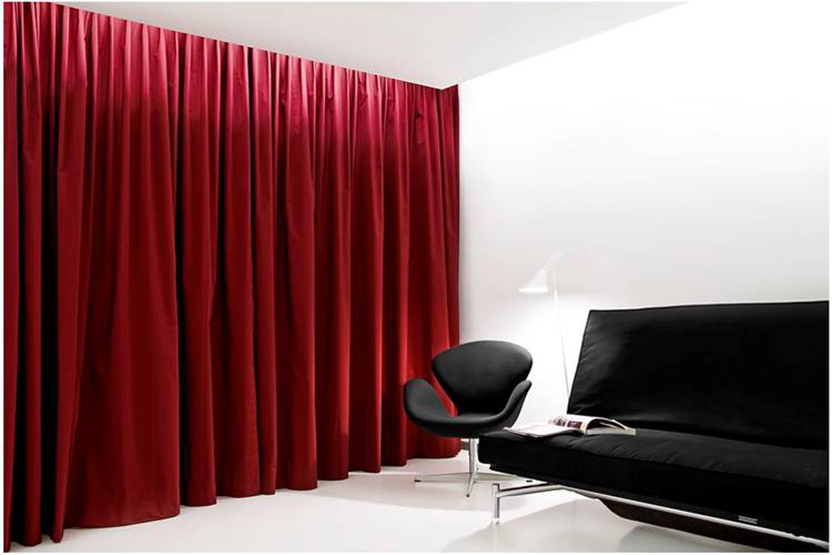 Jedynym mocnym akcentem kolorystycznym są krwistoczerwone zasłony. Zwiewne i jedwabne tkaniny