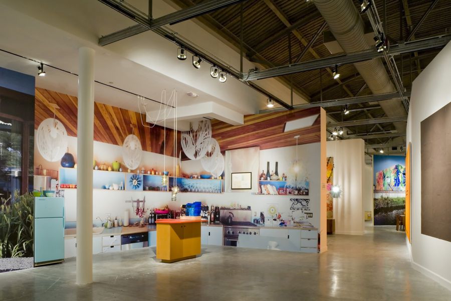 works are organized and presented in separate vignettes that represent various areas of a house: garden,