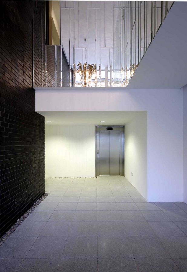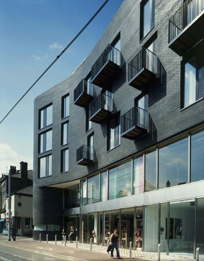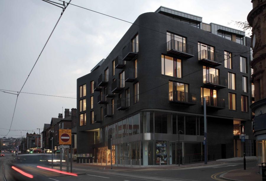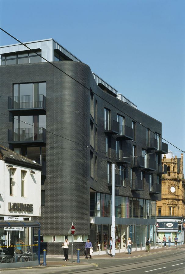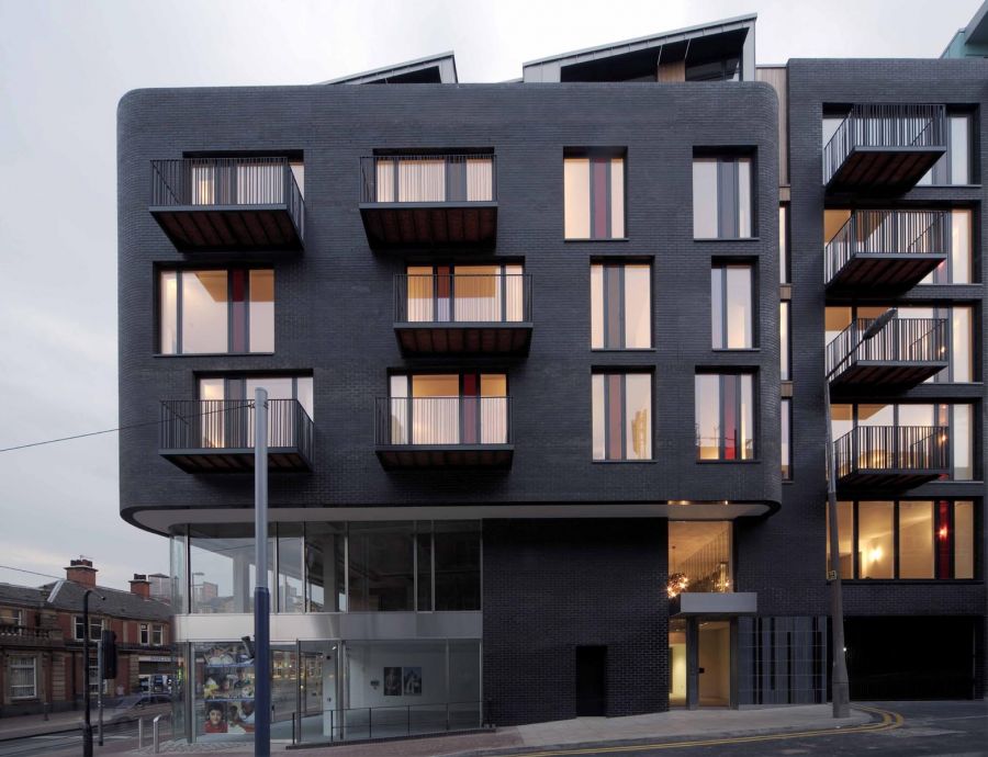 The three public facades of the building are wrapped in jet-black machine made brick challenging the