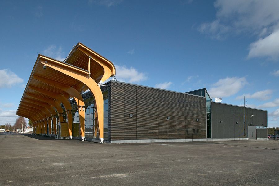 tradition of wood processing. The canopy on the airfield side is supported by glulam arches made from planed
