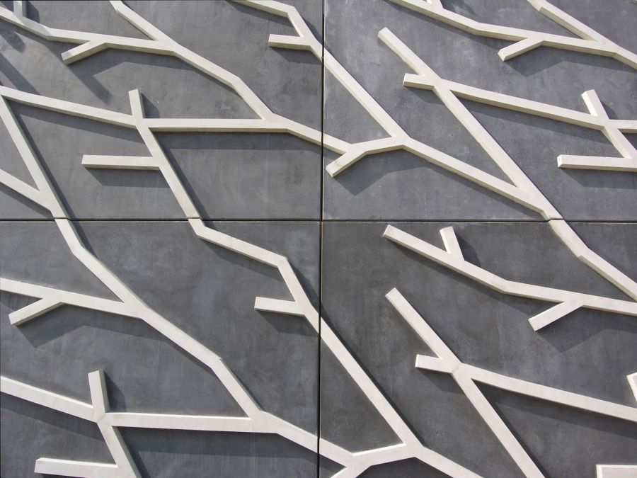 The concrete elements on the north and east façade are solid. The branch-pattern on these panels is
