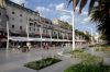 The promenade is defined in space with the outdoor cafés on the north and with light sources, palm trees