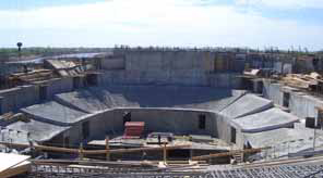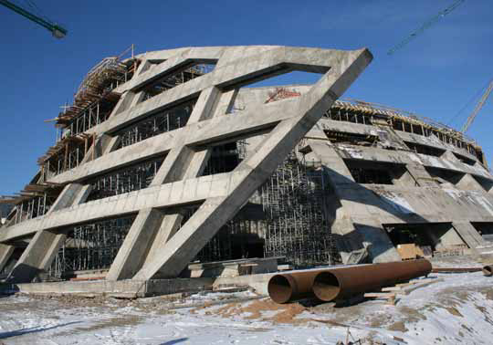 from the steppe, the slanted surfaces of the outdoor sails are clad with glass panels