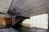 The foyer is constructed in exposed concrete, natural slate and pine timber studs, emphasizing the character