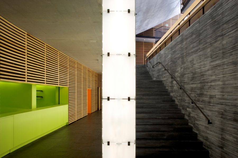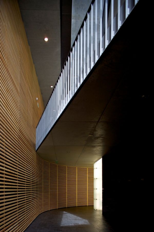 The concrete and glass screen façade acts as a mediator of scale, allowing one to inhabit this exterior wall.