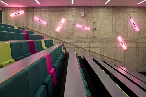 A City academy for 1175 students planned around a linear atrium on a challenging site adjacent to a elevated motorway. Colour is to be used extensively on the elevations, a reaction to the drab quality of the area.