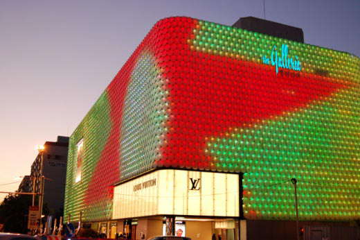 constitutes the largest LED colour display worldwide. The façade can store energy during the day through