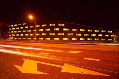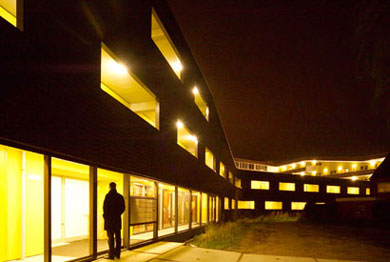of black bricks laid on their side. This skin doesn’t only disguise the scale of the building, but also emphasizes