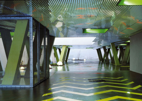 by the hypostyle pattern of the cement columns supporting the building, slanted to give the effect of