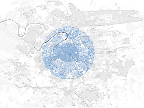 2. Caption image: MVRDV Grand Paris – overview of Paris with all possible interventions. The sum of the interventions is 350% of the needed built program, therefore in the blue circle the intensification zone which addresses the need for new program until 2030, resulting in a more compact city.