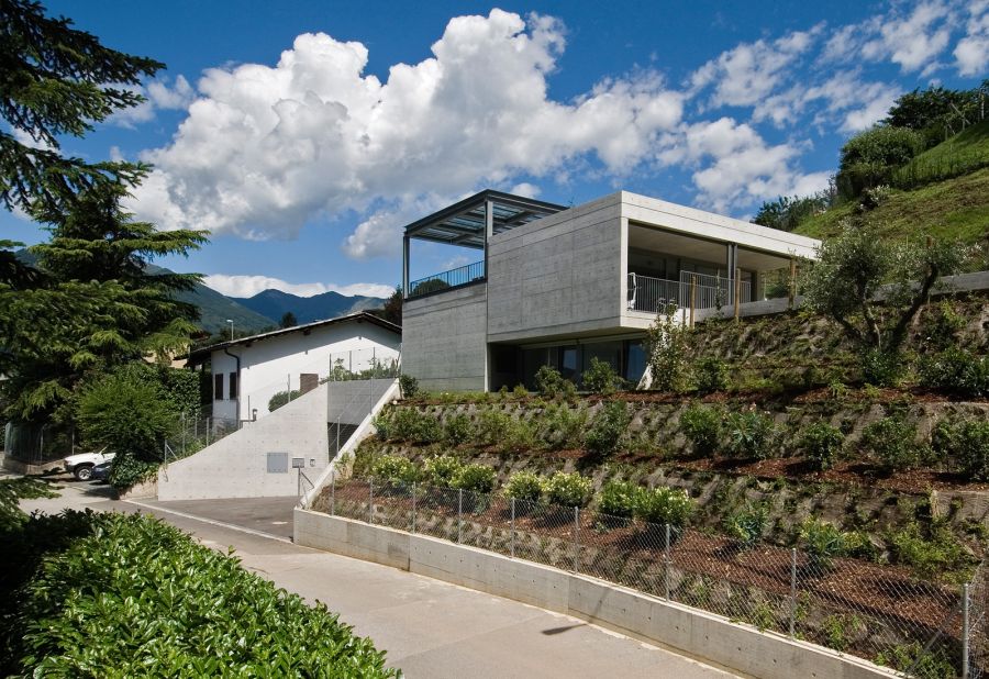 The construction stands on the lower part of a steep slope; it organically integrates with the landscape