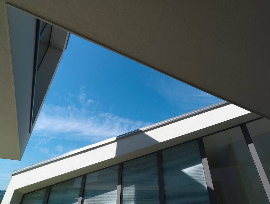 projected into the landscape. The sloped roof that follows the inclination of the land is
