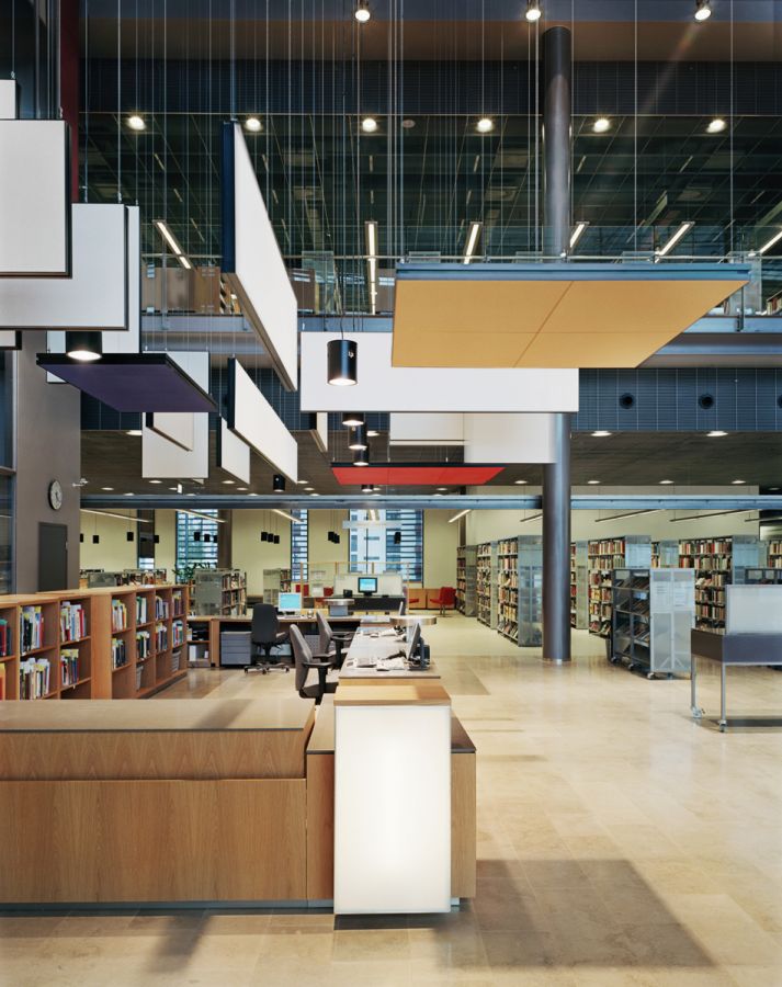 The interior of the library is airy and light. The railings and partition walls are made of glass and steel. The large