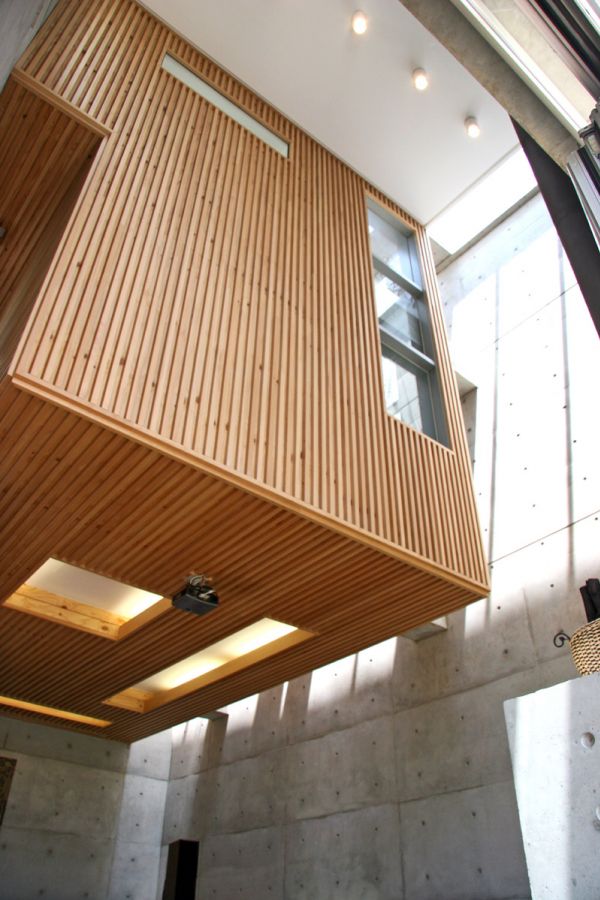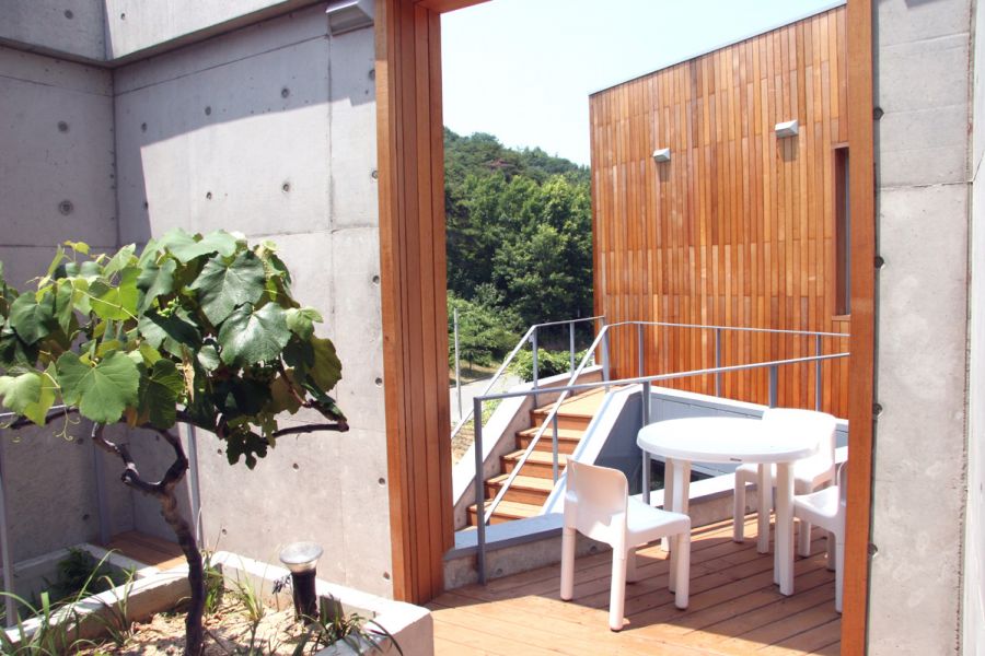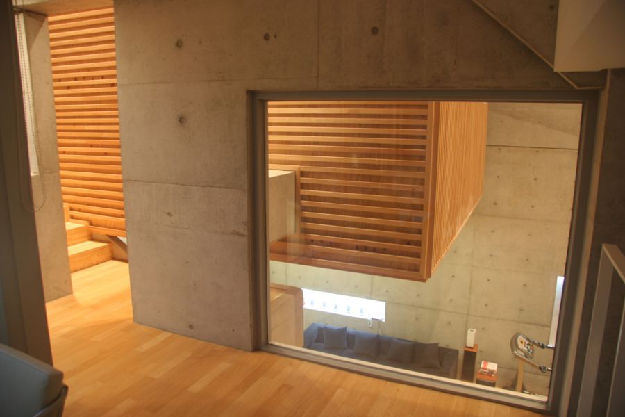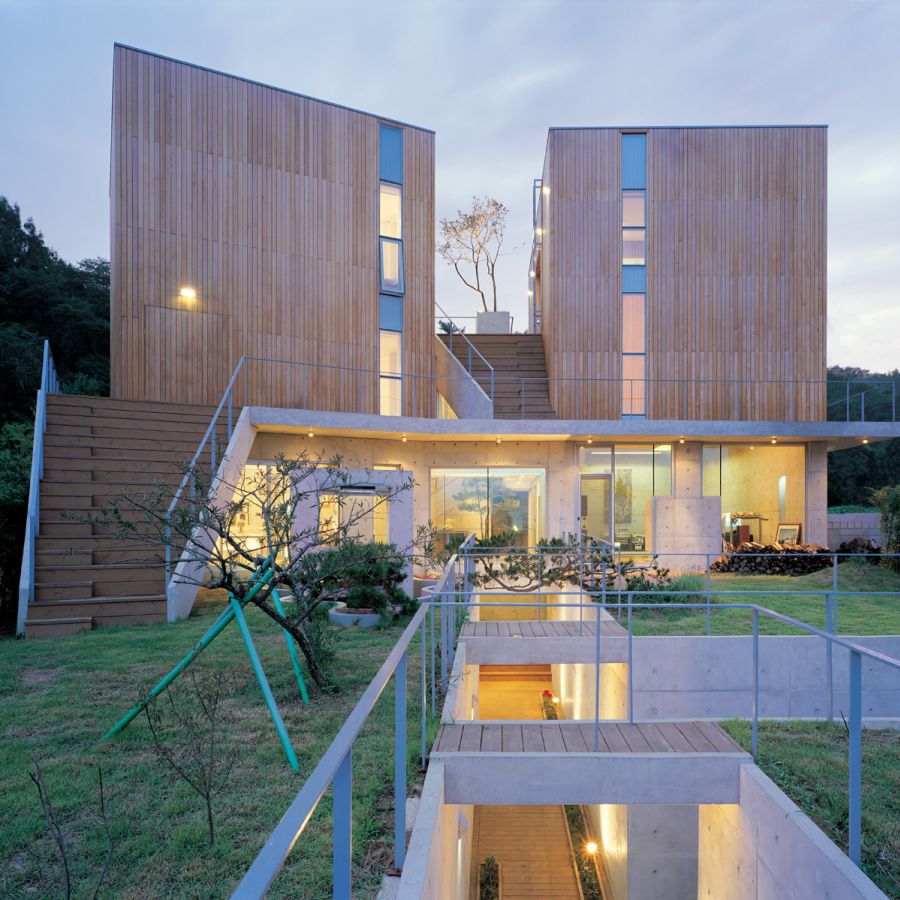 Two wooden boxes which are consisted of duplex room are laid on landscaped architectural mass which contain living room and dining room. The one box contains master bed and study room and another box is consisted of two bedrooms and study rooms for two daughters.