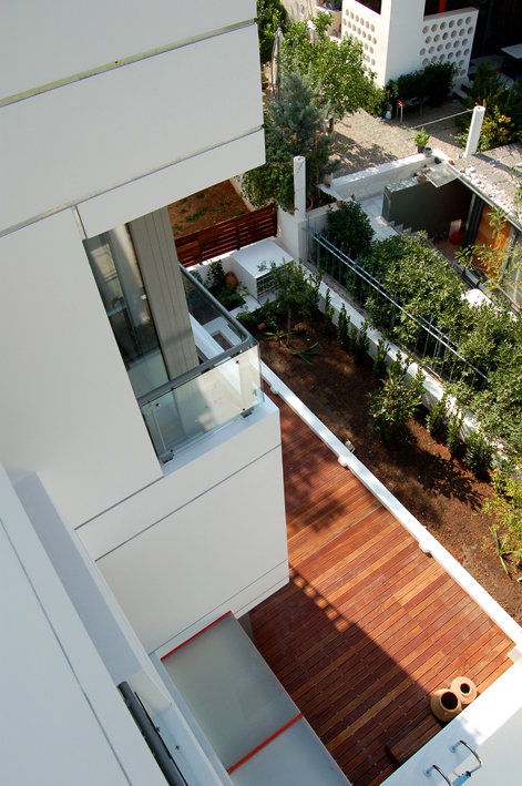 Detailed thermal insulation aided the avoidance of thermal bridges on the building’s envelope while the apertures were positioned diagonally between parallel facades to achieve better natural cross-ventilation. Additional layer of polystyrene insulation was added on the sensitive during summer west elevation in combination with almost no windows. Vertical tents on the north-east and south east elevation provide a second layer of wind and solar protection in collaboration with tall evergreen trees on the north which reduce the effect of the prevailing cold winter wind. White colored facades and the deck which works as a ventilated double skin on the roof garden assist the reduction of cooling load.