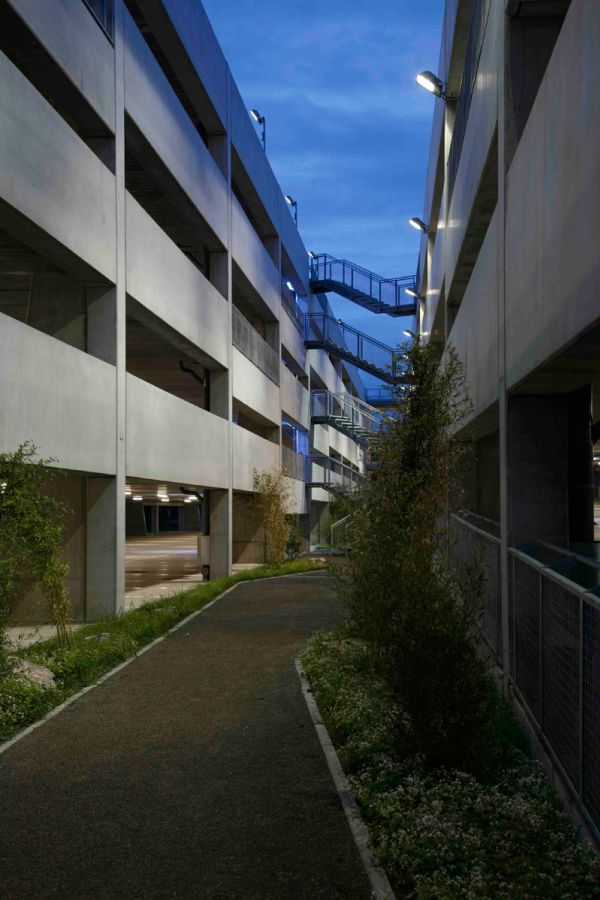 The building will house 850 parking places for hospital staff and visitors. The study focused on the best manner in which to make the routes taken by pedestrians and car drivers both clear and comfortable and to afford them views of Valenciennes. The slope of the parking lot is continuous and the breaks between levels have been removed. This configuration optimises the surface areas of the ramps and allows the site coverage of the future building to be reduced. The acoustic comfort is better and pollution levels are lower. The gain in space is put to good use in several ways. To the north, by keeping a line of existing trees. At the centre of the building, a break consisting of small garden areas brings in natural light and contributes to allowing fumes to escape from the parking areas. To the south, an exterior circulation gallery channels and directs users of the parking lot towards ground level and the entrance to the hospital centre. A large openwork structure consisting of spars of Douglas pine acts as a guard railing and forms the façade on Avenue Désandrouin.