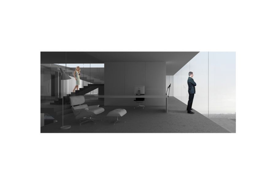 A freight elevator runs all the way up the house, from the display area to the top floor, which is devoted to the everyday living spaces. This transparent elevator makes it possible to move vehicles from one level to another or put them on show in different spaces.