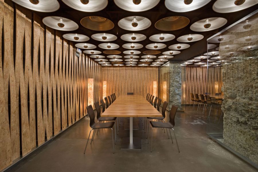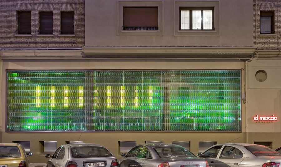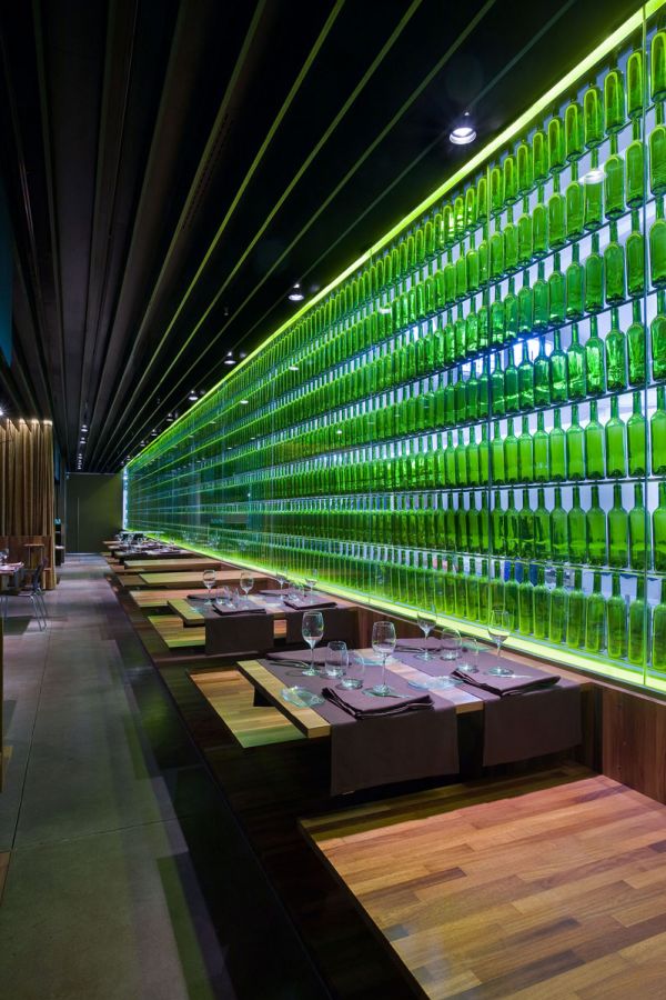 Arguments: always the same: abstract metaphors related to what happens around the project, client, location, usage, ... In this case the use of partners elements with kitchen- food-market, out of context and offered and presented as pictures of Warhol: empty bottle (or drink), pans, butcher tables, ... not as simple slides, but architected (if that word exists): lattice of green glass bottles, lamps and acoustic ceilings of caldrons, tables, benches and floors of tables butcher ...