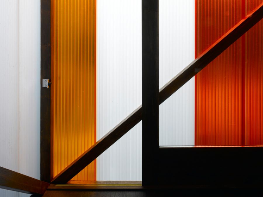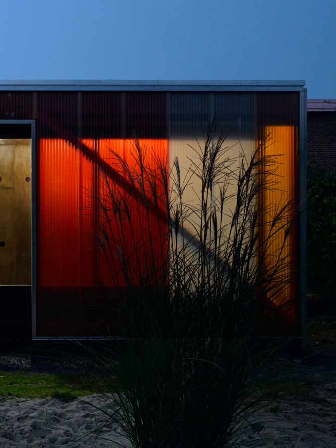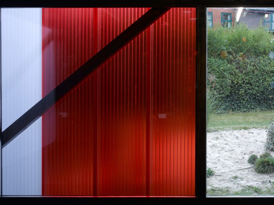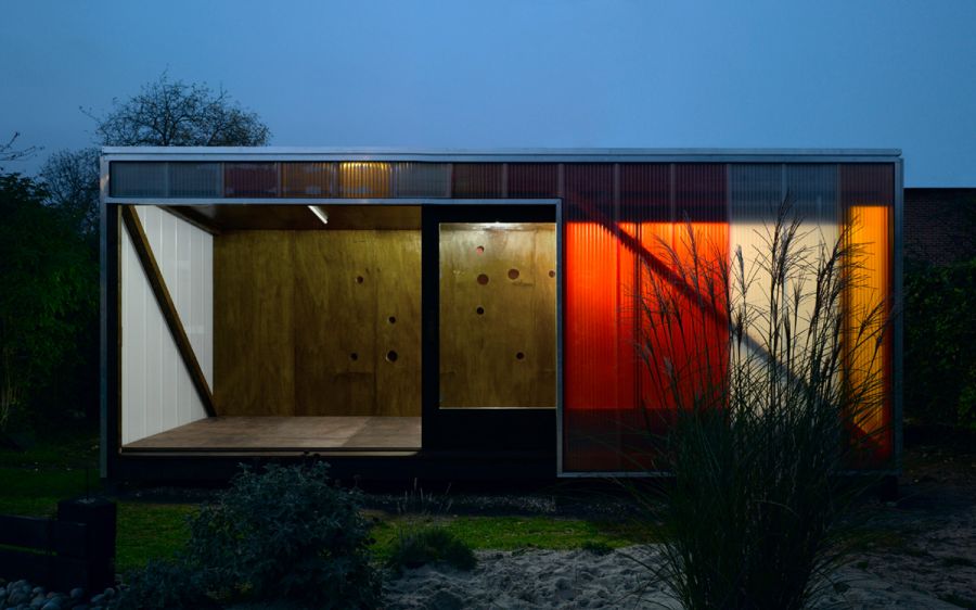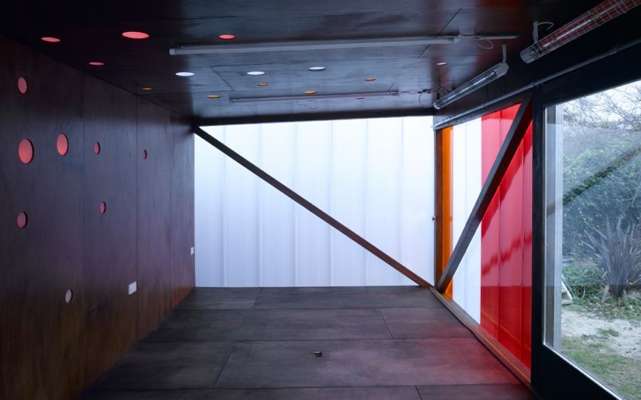 The single-storey out-building combines simplicity of form with neat architectural devices to create a visually exciting building. The tiny budget demanded creative solutions that reduced the number of materials and building trades otherwise required. Where possible, elements were combined such as the structural plywood, which is also used as the internal finish. Crucially, the polycarbonate Rodeca cladding offered rigidity, lightness, water-tightness, translucency, colour and cost-efficiency, eliminating the need for studwork, waterproofing and windows. Several aperatures in the plywood skin allow pools of coloured light into the building during the day, and to emit colour to the surrounding areas at night.