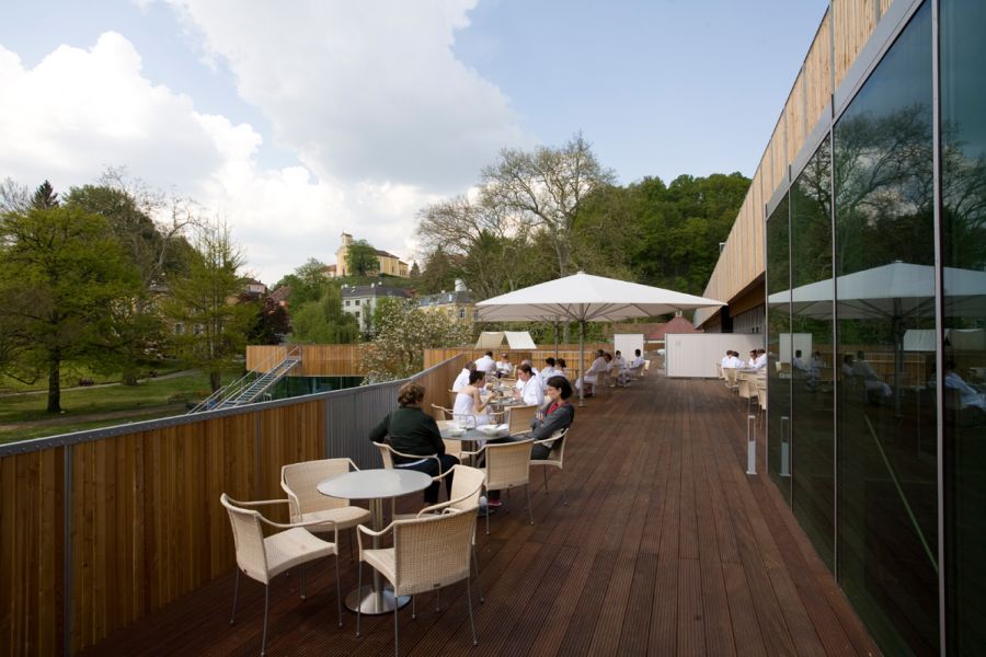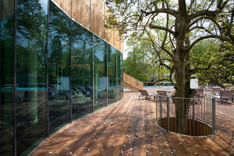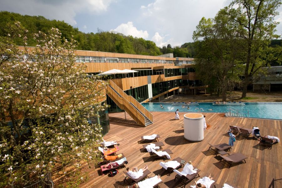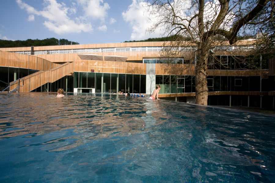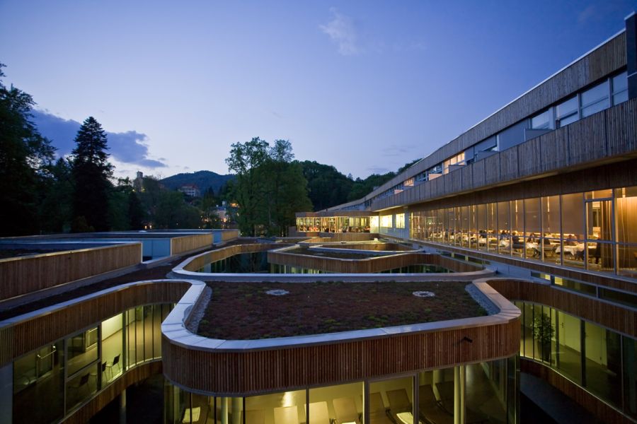 The project is situated in a protected park and consist of a treatment area with about 50 different rooms for medical treatments, a four star hotel with several different restaurants and cafes, and a public thermal bath for the patients and other guests.