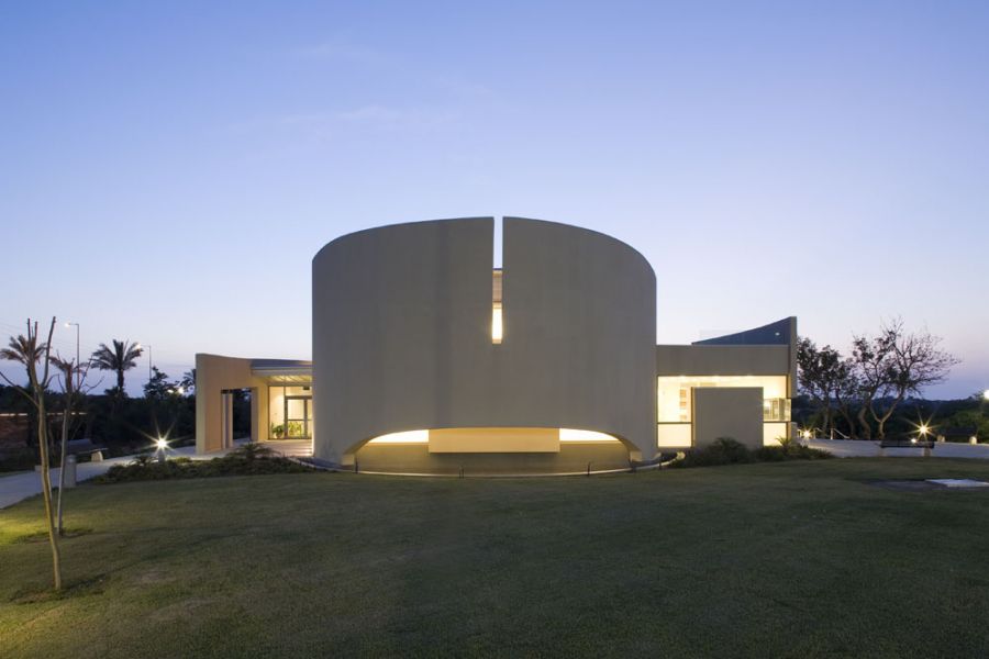 The building is designed as a spiral, which aims to express the cyclic aspect of Judaism, and the connection between circular time and linear time. The experience of circular time is one of recurrence and cyclic motion. The experience of linear time is one of development and change along the timeline. These two systems meet at momentary, unique moments in time, thus creating the spiral continuum. The hub of the Scroll's coming together forms the prayer hall, isolated from its surroundings by the lack of direct visual contact with it. The isolation transforms the place into a microcosm, where the strongest force is that of the light penetrating the building through openings in the ceiling. This hidden light washes over the curved walls, which come together towards the Holy Ark. The Ark hovers over a pool of water and is lit by a soft, indirect light that is reflected in the pool. The place's symbolism as a "Scroll of Light" aims to emphasize the meaning of the creation of light as the foundation of life, and as a symbol of truth, knowledge, and hope.