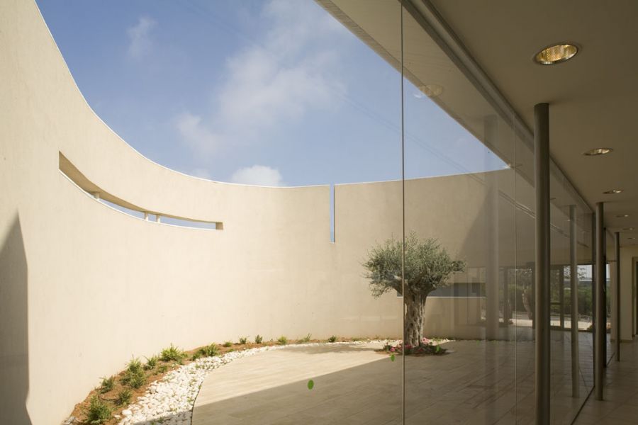Movement in the structure develops alongside the curving "parchment", which leads us towards the inner space and guides us into a process of spiritual change, towards the gradual revelation of the place of prayer. As we gather together we look around us and experience the minimalist inner court, which frames the lone olive tree. The court secludes us from the racket of secular life and connects us, through the most basic means, to the earth and the sky. The space revealed is a world of tranquility and self reflection.