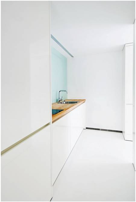 Podobnie postąpiono z kuchnią - jej zabudowa zlewa się z wszechobecną w mieszkaniu bielą, przypomina