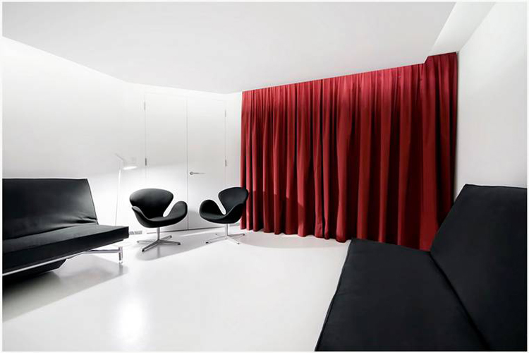 Jedynym mocnym akcentem kolorystycznym są krwistoczerwone zasłony. Zwiewne i jedwabne tkaniny