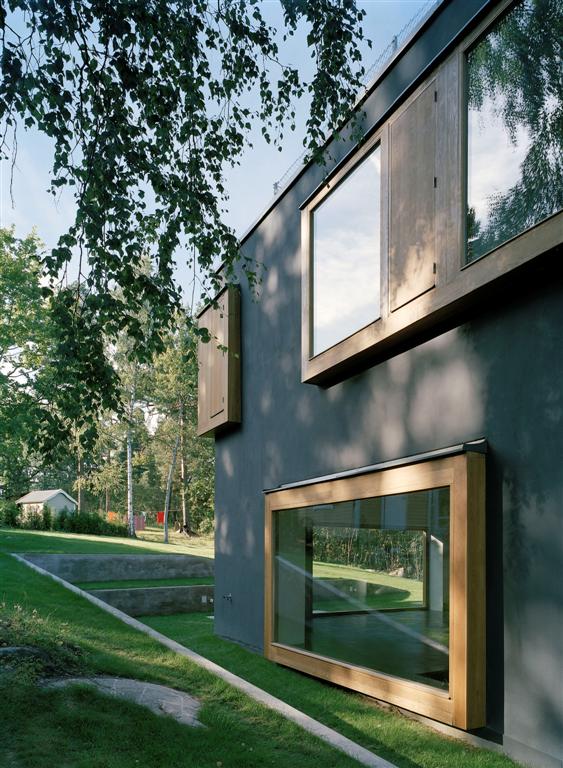 window boxes made of oak add a 3-dimensional quality to the facade, thus enhancing the depth and massive