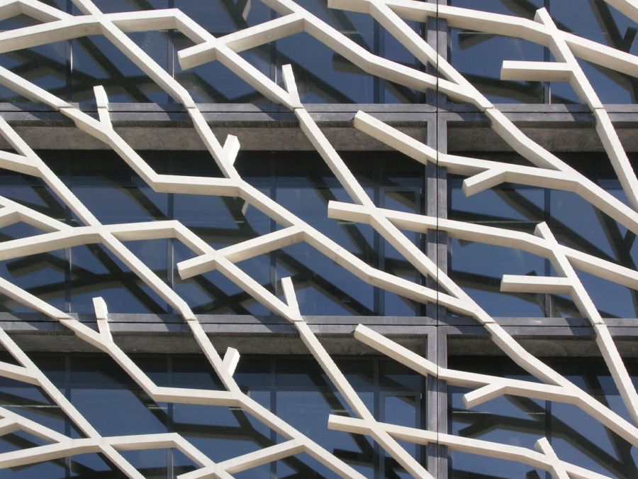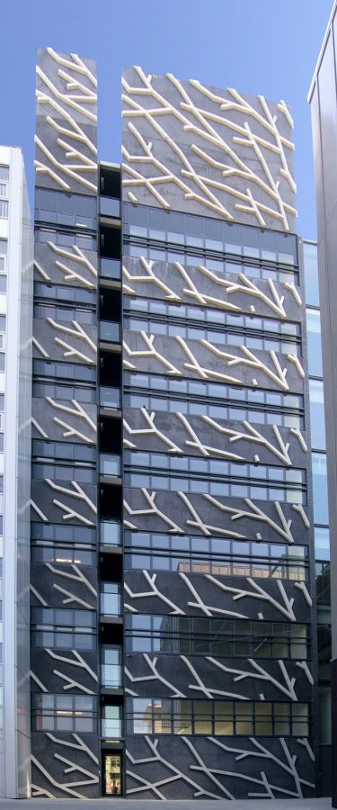 The concrete elements on the north and east façade are solid. The branch-pattern on these panels is