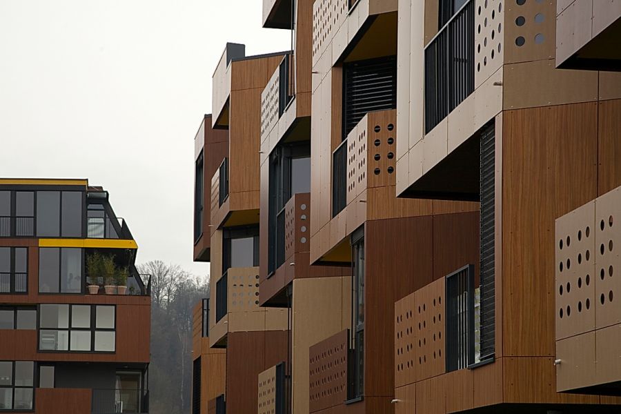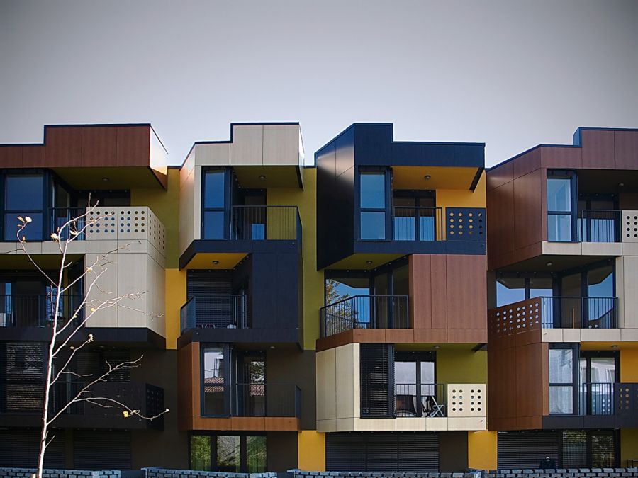 30 degrees window-wings towards the quieter and south orientated side. In the future also 2 more blocks