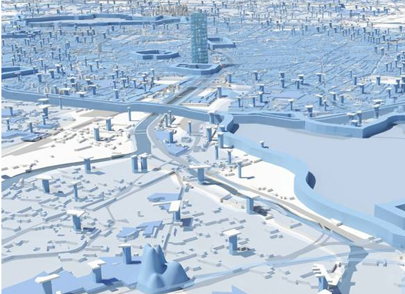 3. Caption image: MVRDV Grand Paris – Detail of Paris with the datascape of abstract volumes of the interventions.